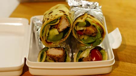 Jajka roztrzepać z mlekiem. Otręby wymieszać z pokruszonymi płatkami kukurydzianymi oraz papryką. Mięso kroimy na kawałki i pospypujemy solą, pieprzem i ulubioną przyprawą (ja użyłam włoskiej). Następnie kawałki mięsa namaczamy w roztrzepanym mleku z jajkiem i obtaczamy w panierce. Teraz albo smażymy na patelni z małą ilością oleju lub pieczemy na blasze wyłożonej papierem do pieczenia/matą silikonową w piekarniku w temp. 180 C przez ok. 25 min. Ulubione warzywa kroimy na cząstki, kawałki, słupki i układamy na naleśnikach, dodajemy mięso, sos (niekoniecznie) i zawijamy w rulony, tak aby jedna strona naleśnika była zamknięta (tzn. tworzyła taką kieszonkę). Jeżeli chcę, by naleśniki były troszkę bardziej mokre, spód naleśnika smaruję musztardą lub ketchupem lub majonezem lub sosem tzatziki.