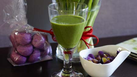 Szpinak miksuję z bananem, do tego dodaję soku z pomarańczy. Kiedy koktajl będzie miał konsystencję gładkiego kremu dodaję jęczmień i ostropest oraz rozrzedzam wodą. Zamiast jęczmienia czy ostropestu dodaję też siemie lniane, otręby czy nasionka chia.