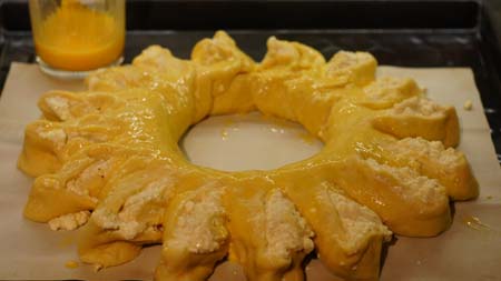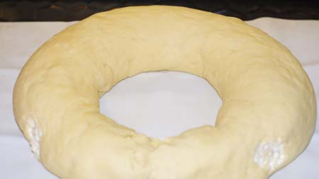 Mąkę wsypujemy do miski, robimy zagłębienie i wlewamy troszkę mleka, dodajemy drożdże i troszkę cukru, mieszamy delikatnie z wierzchu, przykrywamy ściereczką bawełnianą i odstawiamy na 10 min. Jak drożdże troszkę urosną dodajemy resztę mleka, cukru, cukry waniliowe, jajka i wszystko mieszamy. Jak wszystkie składniki się połaczą dodajemy roztopionego masła. Mieszamy i wyrabiamy na stolnicy lub w malakserze. Ja korzystam z malaksera. Jesli ciasto jest za rzadkie można podsypac odrobiną mąki. Wyrabiamy, aż ciasto stanie się elastyczne i gładkie. Przykrywamy ściereczką i odstawiamy na godzinę w ciepłe miejsce. Kiedy ciasto urośnie, rozwałkowujemy je w prostokąt. Podczas tej czynności najlepiej podsypywać mąką, by ciasto się nie kleiło do podłoża. Na tak przygotowane ciasto wykładamy mase serową i rolujemy, zaś brzeg ciasta sklejamy z drugim brzegiem, tak by masa serowa nie wypłynęła. W ten sposób powstał wałek, który formujemy w kółko i sklejamy dwa końce razem. Teraz przystępujemy do formowania kołacza z ciasta. Ostrym nożem robię promienie wałku, przecinając, ale nie do końca. Kiedy powstaną takie kawałki to lekko je odracamy. Gotowy kołacz drożdżowy przykrywamy ściereczkę i odstawiamy na 10 minut. Smarujemy wierzch mlekiem lub jajkiem i wkładamy do piekarnika w 180 C przez 20 minut w funkcji góra-dół. Ostudzone ciasto można polukrować.