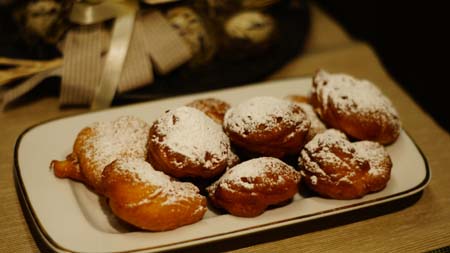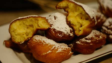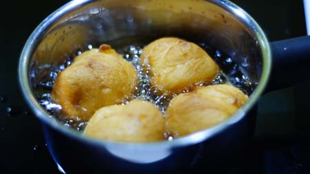 Mąkę łączymy z proszkiem do pieczenia, solą i startą skórką z cytryny. Jajka ubijamy, dodajemy cukier. Kiedy masa jajeczna jest dobrze ubita dodajemy wódkę i serek mascarpone. Następnie dodajemy po łyżce mąki do masy jajecznej i mieszamy, aż do zużycia całej mąki. Ciasto będzie dość gęste. Przekładamy ciasto do szprycy/rękawa cukierniczego i wyciskamy kuleczki na mocno rozgrzany smalec. Temperatura smalcu ma być w miarę wysoka, uważając, by pączki się nie spaliły. Smażymy z obu stron. Gorące pączki wykładamy na ręcznik papierowy i po kilku minutach posypujemy cukrem pudrem.