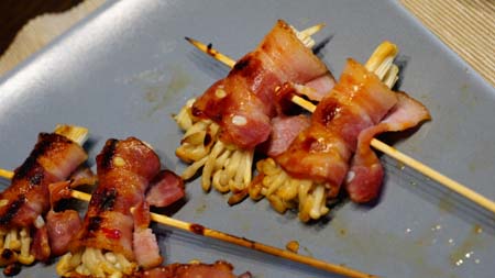 Sos mieszamy z musztardą i keczupem i wkładamy umyte grzyby na pół godziny. Następnie wyciągamy, dzielimy na mniejsze pęczki i owijamy plastrem boczku. Taki gotowy szaszłyk nabijamy na patyczek i grillujemy.