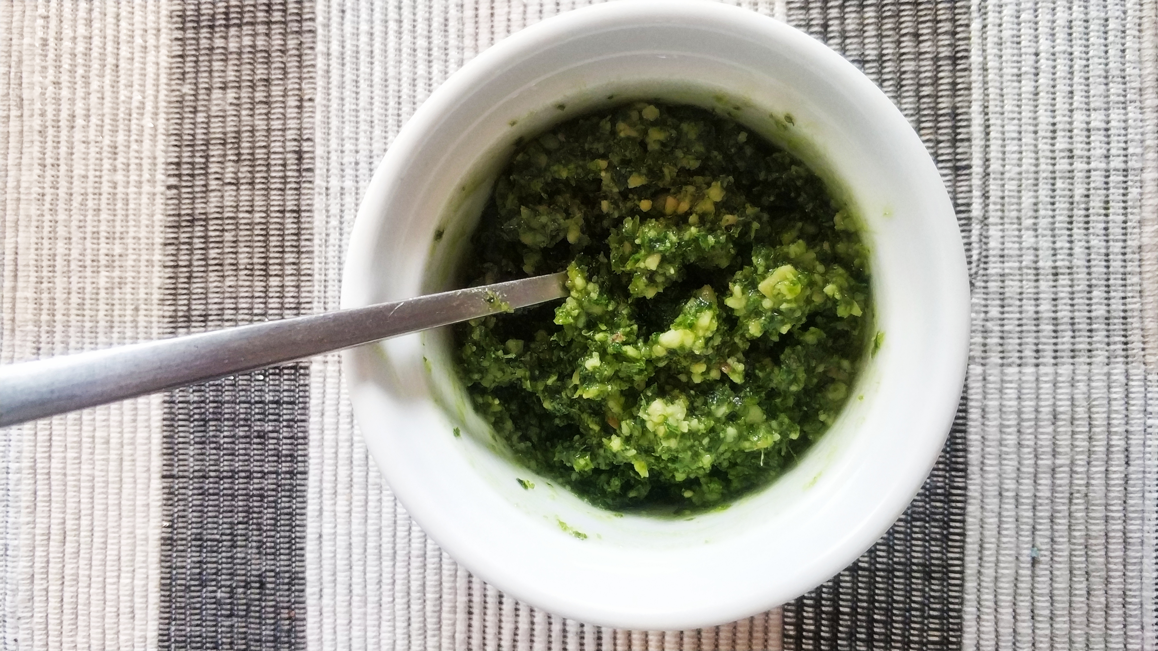 Jarmuż trzeba polubić. U mnie to chwilę trwało. A teraz bardzo często dodaję do zup, makaronów, czy warzyw z patelni. Ostatnio rozsmakowałam się w pesto, właśnie z jarmużu. Można zrobić je na dwa sposoby: lekko poddusić czosnek na oliwie i zblanszować jarmuż, lub wszystko na surowo. Takie pesto za każdym razem można zrobić inne np. dodając orzechy nerkowca, czy podprażone płatki migdałów lub sok z cytryny. Jak kto woli. Jest pyszne, ja najczęsciej podaję je z makaronem lub pieczonymi warzywami. Zapraszam!