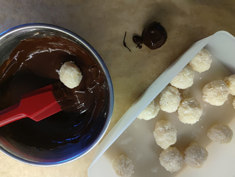 Mus, miód i wiórki lekko blendujemy razem. Formujemy z masy kulki i wkładamy na kilka minut do zamrażarki, by stwardniały. Czekoladę rozpuszczamy w kąpieli wodnej, a następnie zanurzamy w niej kokosowe kulki. Odstawiamy kulki do wystygnięcia. Przechowujemy w pojemniku w lodówce.