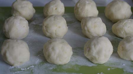 Na 1 kg ziemniaków dajemy 30 dag mąki ziemniaczanej. Jabłka obieram ze skórki i kroję w drobną kostkę, posypuję cukrem i cynamonem, mieszam. Ugotowane ziemniaki ubijam praską na pure. W garnku równo uklepuję ziemniaki, nożem dzielę na 4 części, jedną część wyciagam i na to miejsce wsypuję mąkę ziemniaczaną (do poziomu ziemniaków). Z powrotem dodaję wyciągniętą część ziemniaków i wszystko mieszam. Dodaję jajka i dobrze wyrabiam. Teraz dodaję jabłka i mieszam. Gdyby ciasto było za rzadkie to dodać więcej mąki ziemniaczanej. W dużym garnku gotuję wodę, lekko solę. Z ciasta formuję kule i wrzucam na wrzątek. Gotuję kilka minut, aż lekko "spuchną/napęcznieją". Na patelni rozgrzewam troszkę masła i dodaję bułkę tartą. Gotowe kluski wyciągam z wody i polewam bułką tartą.