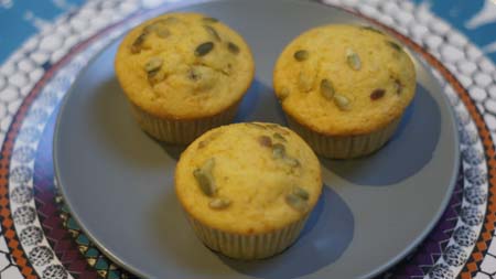 Masło roztopić i ostudzić. Mąkę przesiać do miski razem z proszkiem do pieczenia i sodą. Dodać cukier, sól, skórkę z pomarańczy, wanilię wymieszać i odstawić. W drugiej misce roztrzepać jajka razem z purée z dyni. Dodać roztopione masło i mleko, wymieszać.Teraz wszystkie składniki łączymy za pomocą łyżki: do sypkich składników dodajemy masę jajeczną i delikatnie mieszamy łyżką - ciasto ma być lekko grudkowate, ale surowa mąka nie powinna być widoczna. Nie można zbyt długo mieszać składników. Ciasto wyłożyć do papilotek, na wierzchu można położyć owoce lub pestki dyni jeśli ich używamy. Wstawić do piekarnika. Piec przez około 18-20 minut w 190 C, do suchego patyczka. Można posypać cukrem pudrem.