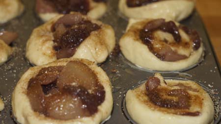 Gruszki obrać, pokroić w ćwiartki. Budyń wymieszać z 2 łyżkami cukru, po czym rozrobić w 100 ml soku. Pozostały sok i gruszki wymieszać i gotować ok. 5 minut. Wlać rozrobiony budyń i mieszając, gotować ok. 1 min. Zostawić do przestygnięcia. Mleko lekko podgrzać i dodać drożdże i 10 g cukru. Mieszając, rozpuścić. Do miski wsypać mąkę, 50 g cukru i szczyptę soli. Dodać jajko, następnie wlać rozpuszczone drożdże. Wyrobić mikserem. Dodać 75 g masła i wyrobić, by ciasto było elastyczne. Przykryć i odstawić w ciepłe miejsce na ok. 45 min. Następnie rozpuścić 5g masła. Cukier (4 łyżki) mieszamy z cynamonem. Wgłębienia w formie do muffinek posmarować tłuszczem. Piekarnik rozgrzać do temp. 200 C. Ciasto ponownie zagnieść, następnie rozwałkować na posypanym mąką blacie na prostokąt. Posmarować rozpuszczonym masłem i posypać 2 łyżeczkami mieszanki cukru z cynamonem. Wyłożyć nadzienie gruszkowe, pozostawiając wolne brzegi. Następnie zaczynając od krótszego brzegu, zrolować. Rulon pokroić na 12 kawałków. Ślimaczki umieścić w wysmarowanych masłem wgłębieniach do muffinek. Posmarować pozostałym masłem i posypać pozostałą mieszanką cukru z cynamonem. Piec 20-25 minut w funkcji góra-dół. Wyjąć i odstawić do wystygnięcia, a następnie posypać cukrem pudrem.