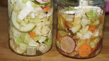 Rzodkiewkę, ogórka i marchew kroimy na cienkie plasterki. Kapustę pekińską szatkujemy. Kalafior rozdzielamy na małe różyczki. Warzywa mieszamy w misce i ciasno układamy w słoiku. Następnie zalewamy marynatą. Jeśli robimy więcej niż jeden słoik, ilość składników na marynatę trzeba proporcjonalnie zwiększyć. Zakręcamy słoik i wstawiamy do lodówki. Po 24 godzinach gotowe do konsumpcji.