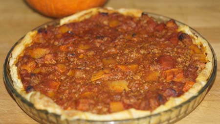 Cebulę i czosnek posiekać. Z dyni usunąć pestki i pokroić w ćwiartki, a następnie w kostkę. Na patelni rozgrzać oliwę i podsmażyć mięso. Następnie dodać czosnek i cebulę. Po ok. 5 minutach dodać dynię i dalej smażyć. Następnie dodajemy pulpę pomidorową, przecier oraz przyprawy. Doprowadzić do wrzenia i gotować ok.10 min. Po zdjęciu z ognia patelni dodajemy pomidorki koktajlowe przepołowione na pól. Mieszamy i pozostawiamy do lekkiego przestygnięcia. Płaty ciasta francuskiego ułożyć jednen na drugim i rozwałkować, a następnie wyciąć koło. Ciasto przekładamy do natłuszczonej formy do tarty i wywijamy brzegi. Spód tarty posypujemy bułką tartą i rozkładamy na to masę mięsno-dyniową. Pieczemy 40 minut. Jeśli wierzch będzie się przypiekał przykryć folią aluminiową.