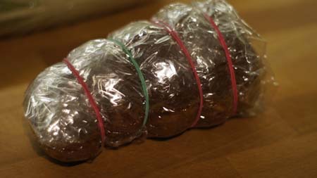 Filet myję i osuszam. Wszystkie przyprawy mieszam w miseczce a następnie nacieram mięso. Przyprawy mają wejść w każde zagłębienie mięsa. Zużywam całą przygotowaną mieszankę.Tak opanierowany filet zwijam w rulon, jeśli jest płaski i przekładam na folię spożywczą i szczelnie owijam. Teraz przekładam do rękawa do pieczenia i bardzo szczelnie zwijam. Na tak przygotowany filet naciągam kilka gumek recepturek (poniżej zdjęcie). Tak przygotowany filet wsadzam do garnka i zalewam zimną wodą. Gdy woda zacznie wrzeć gotujemy 30 minut. Wyłączam i pozostawiam pod przykryciem przez 15 minut. Następnie wyciagam z folii mięsko, przekładam na talerz, przykrywam folią aluminiową i pozostawiam do wystygnięcia. Kiedy przestygnie chowam do lodówki. Kroimy w cienkie plastry.