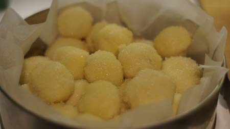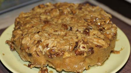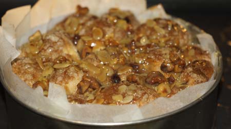 Zaczynamy od pieczenia orzechów w piekarniku nagrzanym do 175C przez 8 minut. W rondelku rozpuszczamy 125 g masła, dodajemy cukier trzcinowy i śmietankę. Gotujemy 4 minuty. Następnie dodajemy ekstrakt waniliowy, ocet, rum, sól i prażone orzechy (siekam je na średnie kawałki). Odlewamy pół szklanki masy, a resztę wlewamy do tortownicy i wkładamy na 20 minut do zamrażalnika. Szklankę z odlaną masą pozostawiamy w temperaturze pokojowej. Pozostałe 60 g masła roztapiamy. Do miski wsypujemy cukier kryształ. Oddzielamy kawałki ciasta i formujemy z nich kuleczki (wielkości małych pyz). Każdą kuleczkę moczymy w maśle, a następnie obtaczamy w cukrze. Kuleczki wkładamy do wyjętej z zamrażarki tortownicy tworząc dwie warstwy. Gdy zużyjemy całą porcję ciasta, tortownicę odkładamy w ciepłe miejsce na ok. pół godziny. Piekarnik rozgrzewamy do 175 C. Pieczemy bułeczki ok. 55 minut na złoto. Wyjmujemy z piekarnika i wierzch smarujemy odłożoną masą. Studzimy 10 minut w tortownicy, przekładamy na talerz, tak aby spód znalazł się na górze.