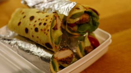 Jajka roztrzepać z mlekiem. Otręby wymieszać z pokruszonymi płatkami kukurydzianymi oraz papryką. Mięso kroimy na kawałki i pospypujemy solą, pieprzem i ulubioną przyprawą (ja użyłam włoskiej). Następnie kawałki mięsa namaczamy w roztrzepanym mleku z jajkiem i obtaczamy w panierce. Teraz albo smażymy na patelni z małą ilością oleju lub pieczemy na blasze wyłożonej papierem do pieczenia/matą silikonową w piekarniku w temp. 180 C przez ok. 25 min. Ulubione warzywa kroimy na cząstki, kawałki, słupki i układamy na naleśnikach, dodajemy mięso, sos (niekoniecznie) i zawijamy w rulony, tak aby jedna strona naleśnika była zamknięta (tzn. tworzyła taką kieszonkę). Jeżeli chcę, by naleśniki były troszkę bardziej mokre, spód naleśnika smaruję musztardą lub ketchupem lub majonezem lub sosem tzatziki.