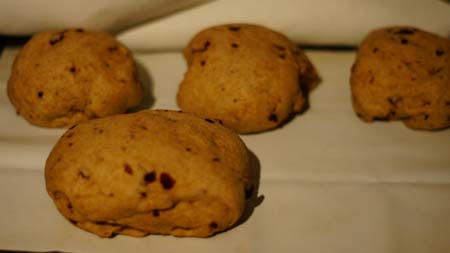 Wszystkie suche składniki mieszamy, włącznie z żurawiną. Powoli dolewamy wodę i zagniatamy ciasto na stolnicy lub w malakserze. Ja zdecydowanie wykorzystuję do wyrabiania ciast malakser Kenwooda, który sprawdza się rewelacyjnie przy tej funkcji. Kiedy ciasto będzie gładkie, dobrze wyrobione, zostawiam je na 1,5 h w tej samej misce i przykrywam ściereczką. Po tym czasie wyciagam ciasto, formuję z niego rulon, który dzielę na 4 części. Z każdej części formuję bułeczkę metodą zawijania pod spód-zlepiam dwa końce ciasta leżące na przeciwko siebie, a następnie robię to samo z drugimi bokami. Bułeczki przykrywamy bawełnianą ściereczką i pozostawiamy w miejscu ciepłym, bez przeciągów do wyrośnięcia. Pieczemy w 200 C przez ok. 15 minut.