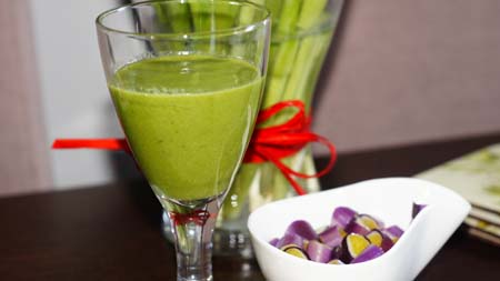 Szpinak miksuję z bananem, do tego dodaję soku z pomarańczy. Kiedy koktajl będzie miał konsystencję gładkiego kremu dodaję jęczmień i ostropest oraz rozrzedzam wodą. Zamiast jęczmienia czy ostropestu dodaję też siemie lniane, otręby czy nasionka chia.