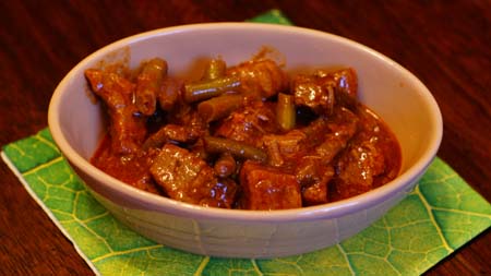 Mięso kroję w kostkę, posypuję kminkiem i pieprzem i obsmażam na mocno rozgrzanym oleju. Cebulę kroję w piórka i duszę na złoto. Podczas duszenia cebuli dodaję słodką paprykę, koncentrat pomidorowy i przesmażam wszystko razem. Następnie dodaję 0,5 l ciepłej wody. Mięso mieszam z cebulą, dodaję esencję lub vegetę i duszę mięso do miękkości. Na koniec dodaję fasolkę, duszę kilkanaście minut wszystko razem i gotowe.