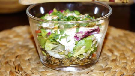Do miseczki wkładam: mix sałat, ogórka pokrojonego na cząstki, paprykę pokrojoną na paski, przepołowione pomidorki oraz mięsko. Układam warstwowo, na dno wykładam mięso, na to sałaty i resztę warzyw, doprawiam i polewam 2-3 łyżkami jogurtu greckiego. Wierzch posypuję ziarnami i szczypiorkiem i ewentualnie jeszcze raz przyprószam pieprzem i solą.