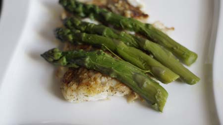 Rybę myję, osuszam i polewam sosem sojowym, pokrojoną drobno papryczką i przyprawami, odstawiam na kilka minut. Szparagi (zdrewniałe końcówki obcinamy) gotuję al dente. Na gorącej patelni rozgrzewam olej i wykładam na nią rybę. Smażę z obu stron po kilka minut (trzeba sprawdzić po kilku minutach). W połowie smażenia dodaję łyżkę masła. Na talerz wykładam danie: dorsza, na nim kilka szparag i polewam łyżką rozpuszczonego masła.