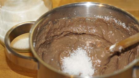 Zagotować wodę z cukrem, dodać margarynę i mieszać do jej rozpuszczenia. Kiedy składniki wszystkie się rozpuszczą zdejmujemy z ognia i dodajemy mleko w proszku i kakao dokładnie mieszając. Kiedy masa będzie gładka tj. bez grudek dodajemy rodzynki i kokoski (oczywiście nie jest to konieczne, ja dodaję bo mi tak smakuje). Każdą warstwę wafla smaruję masą. Gotowy wafel owijam w sreberko lub papier śniadaniowy i na wierzch kładę grubą książkę. Aby wafel dobrze się skleił potrzebny jest obciążnik, którym jest książka. Po ok. 3 godzinach kroję wafla w romby lub kwadraty.
