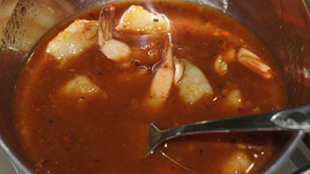 Krewetki obieramy (chyba, ze korzystamy z już obranych), wkładamy do miseczki i zalewamy marynatą na ok. godzinę. Marynata: Kimchi, sos sojowy, ostra papryka, sok z cytryny i przeciśnięty przez praskę czosnek oraz posiekaną natkę. Smażymy na rozgrzanym oleju przez kilka minut. Nie wolno smażyć za długo, bo krewetki staną się twarde. Podajemy same lub z sosem ostro-słodkim.