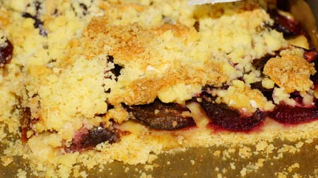 Po godzinie wyjmuję z lodówki ciasto, rozwałkowuję na prostokąt i umieszczam w blaszce wyłożonej papierem, wstawiam do nagrzanego do 180 stopni piekarnika na 10-12 minut. Po tym czasie ciasto wyjmuję z piekarnika, układam na nim jedna przy drugiej połówki śliwek, które oprószam cynamonem. Białka ubijam i rozsmarowuję na śliwkach. Całość posypuję kruszonką i wkładam dalej do piekarnika na 30-35 minut.