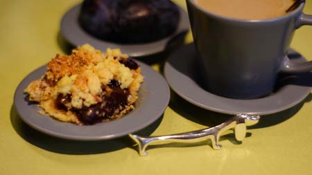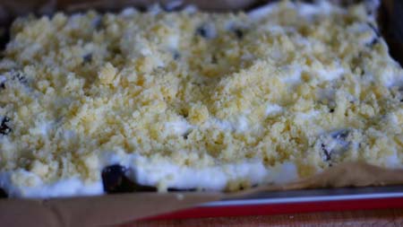 W tym czasie przygotowuję kruszonkę: masło roztapiam i studzę, a następnie wsypuję cukier i mąkę i mieszam, aż powstaną grudki. Jeśli kruszonka jest zbyt płynna, dosypuję mąkę.