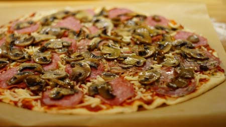 Drożdże wkruszam do kubka, mieszam z ciepłą wodą, olejem i cukrem. Gotowy płyn wlewam do mąki i mieszam najpierw łyżką, a następnie przekładam do malaksera z końcówką do wyrabiania ciast drożdżowych. Gotowe ciasto odstawiam do wyrośnięcia przykrywając je bawełnianą ściereczką (tak na ok. pół godziny). W tym czasie przygotowuję sos pomidorowy (przepis na blogu: http://kuchnia.e-par.org/1_1_293_sos-pomidorowy-do-pizzy-i-nie-tylko.html). Teraz kroję składniki na wierzch pizzy. Ja użyłam: salami, szynkę, ser żółty i mozarellę, pieczarki (wcześniej je delikatnie podsmażyłam) i troszkę papryki. Ciasto wyciągam z miski i delikatnie formuję kulę, którą to następnie przedzielam na pół i w ten sposób wyjdą nam dwie pizze. Jeżeli nie potrzeba nam aż dwóch pizz to jedną część wkładam do plastkiowego pojemniczka i chowam do lodówki (trzeba zużyć w ciągu 2 dni). Ciasto wykładam na stolnicę, lekko oprószam mąką i formuję okrągły blat pizzy, lekko rozciągając palcami. Kiedy spód ciasta jest już uformowany, przekładam go na papier do pieczenia, smaruję sosem pomidorowym, sypię serem żółtym i obkładam wg uznania dodatkami do pizzy i przyprawami. W międzyczasie rozgrzewam piekarnik do 240 C, góra-dół. Gotową pizzę wkladam do nagrzanego piekarnika, na rozgrzaną blachę i piekę ok. 8-10 min. Nie wydłużam czasu, bo się spali. Wyciągam z piekarnika, ściągam z blachy, kroję na trójkąty i podaję.