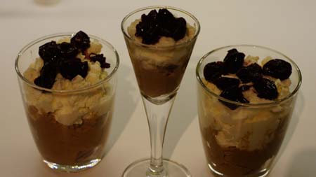 Czekoladę łamię na kawałki i roztapiam w miseczce na parze. Śmietanę ubijam w dwóch miskach i do jednej dodaję lekko ostudzoną czekoladę, delikatnie, ale dość dokładnie mieszam, a do drugiej dodaję cukier puder, aromat waniliowy i ziarenka ze środka laski wanilii. Ja ułożyłam dwie warstwy, ale można więcej-w zależności od wielkości pucharków deserowych. Na wierzch układam kilka wiśni z syropu. I gotowe :)