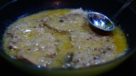 Mięso rozbić, posolić, dodać pieprzu, obtaczamy w mące. Cebulę kroimy w piórka i dusimy. Jak cebula się zezłoci kładziemy na patelnie plastry schabu i smażymy na gorącym oleju. Następnie podlewamy wodą ok. pół szklanki, dodajemy ziele i liść laurowy, przykrywamy pokrywką i dusimy na małym ogniu ok. godziny. Sos zagęszczamy łyżką mąki. Ewentualnie doprawiamy ulubionymi przyprawami.