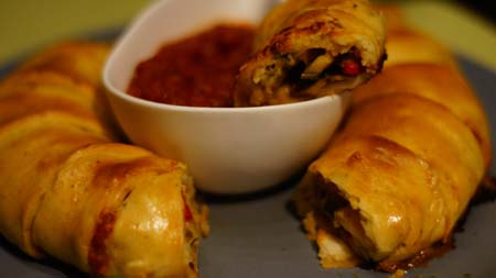 Fajny pomysł z ciasta francuskiego na słono (jeśli ktoś woli, można zrobić to danie z ciasta drożdżowego na pizze). Danie to sprawdza się zwłaszcza na kolację ze znajomymi. Każdy sobie odrywa kawałek i macza w sosie....mniammm. Pomysł zaczerpnięty z internetu, nawet nie wiem z jakiej strony, bo już kilka razy widziałam w różnych wariacjach. Ja proponuję taki zawijaniec francuski. Zapraszam!