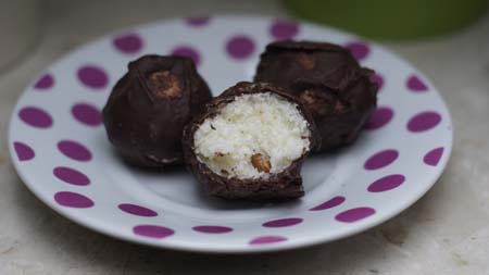 Wiórka przekładamy do miski, dodajemy mleko i esencję, mieszamy. Powstanie gęsta masa, z której formujemy kulki. Kulki chłodzimy przez 15 minut w lodówce, a następnie wkładamy po jednym migdałku do każdej kulki, rolujemy między dłońmi. Rozpuszczamy czekoladę z olejem kokosowym. Następnie każdą kulkę obtaczamy w czekoladzie i odstawiamy na pergamin do przestygnięcia. Oblane czekolada kulki można dodatkowo posypać np. starta czekoladą czy zmielonymi orzechami, kawałkami pistacji, etc. Gotowe kulki przekładamy na talerz/blaszke, czy cokolwiek i wkładamy na dobre pół godziny do lodówki. Generalnie cały czas przechowujemy je w lodówce.