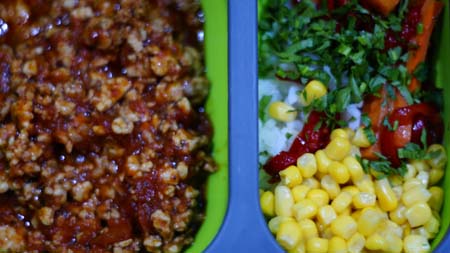 Do dwóch pojemniczków wkładam po porcji makaronu, a do dwóch następnych po porcji ryżu. Mięso w sosie dzielę na 4 części i wykładam do pojemniczków. Z boku wykładam po porcji pieczonych warzyw, po 2 łyżki odsączonej kukurydzy z puszki i wszystko posypuję natką. Tak przygotowane pojemniki przechowujemy w lodówce.