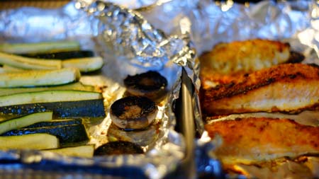 Czosnek przepuszczam przez praskę i przekładam go do miseczki. Następnie dodaję sos sojowy i przyprawy, mieszam. Cukinię kroję w paski, ziemniaki w większą kostkę lub ćwiartki, brokuł rozdzielam na małe różyczki. Tak przygotowaną pastą smaruję każdy kawałek ryby, a następnie warzywa. Blaszkę wykładam papierem do pieczenia i układam na niej warzywa i rybę. Piekę w nagrzanym do 200 C piekarniku. W trakcie pieczenia zmniejszam do 180 C. Piekę ok. pół godziny (trzeba zaglądać do piekarnika i sprawdzać - każdy piekarnik piecze inczej). I danie gotowe.