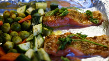 Tak przyrządzonego łososia moje dziecko uwielbia, chyba też nie tylko ono :) Danie bardzo fajne w przyrządzeniu, gdyż wszystko się piecze na jednej blaszce i w jednym czasie. Najczęściej piekę rybę z takimi warzywami, jakie akurat mam w lodówce, ale bardzo lubię z cukinią, batatami i marchewką. Danie to często zabieram ze sobą do pracy. Smacznego!