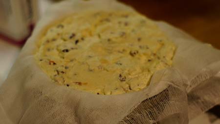 Ser zemleć trzykrotnie. Bakalie drobno kroimy, rodzynki namaczamy (można w gorącej wodzie lub rumie). Masło utrzeć z cukrem, a następnie dodawać po 1 żółtku. Kiedy masło z żółtkami się połączy, dodajemy po łyżce twarogu. Teraz dodajemy bakalie, dokładnie mieszamy. Sitko wykładamy podwójnie złożoną gazą i wykładamy na to masę serową dociskając łyżką. Brzegami gazy przykrywamy wierzch masy serowej i obciążamy talerzykiem. Paschę wstawiamy do lodówki na noc, można dodatkowo obiążyć np. położyć puszkę na talerzyk. Płyn, który spłynął z masy wylewamy. Rozwijamy gazę od góry, przykładamy talerz ozdobny/paterę i odwracamy paschę podnosząc sitko. Można paschę przyozdobić wg uznania.