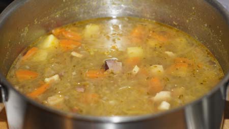Warzywa myjemy i obieramy. Fasolę płuczemy w zimnej wodzie i zalewamy wodą - odstawiamy ją na pół godziny, a w tym czasie przygotowuję składniki na zupę. Fasolę trzeba moczyć co najmniej 8 godzin. Marchew i pietruszkę kroimy w małą kostkę. Ziemniaki w większą kostkę. Do wody dodaję seler, liście laurowe, ziele, vegetę, boczek, groch i gotujemy. Cebulkę kroimy w kostkę i podsmażamy na oleju, następnie dodajmy kiełbaskę pokrojoną w plasterki. Kiedy się zezłoci dodajemy do zupy. Nie zawsze podsmażam kiełbasę, jak mi się śpieszy to nie dodaję cebuli, a kiełbasy nie podsmażam. Ja tym razem użyłam zeberek. Zupa powinna dość długo się gotować, gdyż wtedy fasolka zmięknie i zupa zgęstnieje. W połowie gotowania dodaję ziemniaki i czosnek przeciśnięty przez praskę. Przed końcem gotowania doprawiam, dodaję dość sporo majeranku, boczek wyjmuję i kroję na mniejsze kawałki i zupa gotowa.
