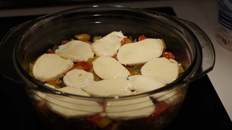 Pierś z kurczaka kroimy w kostkę. Cebulę kroimy w półksiężyce. Papryki kroimy w kostkę. Pieczarki obieramy i kroimy w plasterki. Na patelni dusimy cebulę na złoty kolor, następnie dodajemy mięso i doprawiamy. Ja użyłam przyprawy włoskiej, słodkiej papryki, szczypta ostrej papryki, sól. Ryż gotuję, ale na al`dente. Pieczarki duszę i doprawiam vegetą, solą i dużo pieprzu. Papryki lekko podduszam na patelni na oleju, doprawiam delikatnie do smaku. Ryż mieszam z pieczarkami i wykładam na dno naczynia żaroodpornego. Na to wykładam pierś z kurczaka z cebulką, następnie papryki. Na sam wierzch wykładam mozarellę pokrojoną na plastry. Wkładam do gorącego piekarnika i piekę ok. 40 min. w funkcji góra-dół w 180 C.