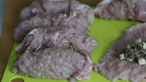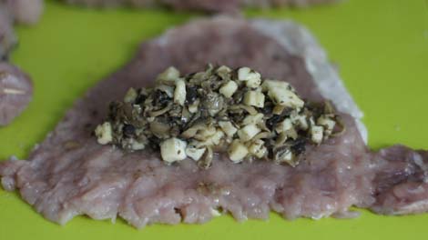 Mięso rozbijamy, ale delikatnie, by nie porozrywać struktury mięsa. Ser kroimy w kostkę, pieczarki także, można w plasterki, ale wygodniej będzie w kostkę. Cebulę także kroimy w drobną kostkę. Pieczarki dusimy z cebulą, doprawiamy solą i pieprzem. Kiedy przestygną dodajemy ser, mieszamy. Każdy płat mięsa solimy, pieprzymy i nadziewamy masą pieczarkową i rolujemy spinając wykałaczkami każdą roladkę. Następnie podsmażamy na gorącym oleju, dolewamy troszkę wody i dusimy. Por kroimy w plasterki i dorzucamy do roladek, nakrywamy pokrywką. Kiedy mięso i por będą miękkie dodajemy śmietanę i chwilkę dusimy razem. Próbujemy i ewentualnie doprawiamy np. papryką w proszku czy vegetą ekologiczną.