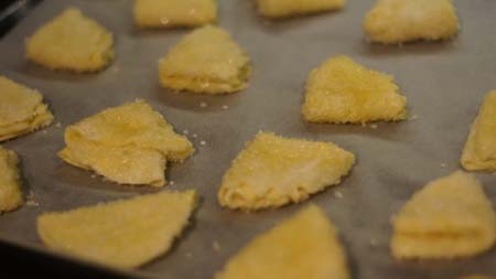 Mąkę przesiewamy przez sito razem z cukrem pudrem. Masło kroimy na małe kosteczki (można zetrzeć na tarce, tylko musi byc bardzo zimne) i dodajemy do mąkiszybko siekając nożem. Dodajemy także serek. Kiedy w miarę składniki są połączone dodajemy żółtka i zagniatamy na jednolite ciasto. Owijamy folią i wkładamy na godzinę do lodówki. Następnie odkrajamy kawałek ciasta i rozwałkowujemy na ok. 1 mm grubości. Pamiętajcie, by ciasto podsypywac mąką,aby nie przykleiło się do stolnicy, czy wałka. Wykrawamy dużą foremką lub dużą szklanką (co najmniej o średnicy 8-10 cm). Każdy placek obtaczamy w cukrze, następnie składamy na pół i znowu na pół tworząc trójkąt. Ponownie obtaczamy w cukrze i układamy na blasze wyłożonej papierem do pieczenia. Gdyby cukier nie chciał się trzymać ciasta, można delikatnie smarowac roztrzepanym jajkiem i wtedy ocukrować. Pieczemy około 20-25 min. w temperaturze 180 C w funkcji góra-dół.