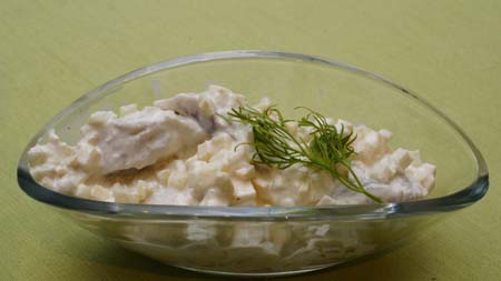 Śledzie moczymy w wodzie przez ok.2 godz. Następnie kroimy je w 2-3 cm kawałki. Jabłko kroimy w bardzo drobną kosteczkę. Cebulę też w drobną kostkę. Śledzie łączymy z cebulką i jabłkiem. Sos: śmietanę mieszamy z majonezem, dodajemy pieprz. Tak przygotowanym sosem polewamy śledzie z warzywami.