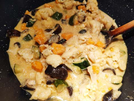 Warzywa myjemy i kroimy na kawałki. W woku rozgrzewamy olej i smażymy czosnek i imbir, po chwili dodajemy przyprawy:chili liście kaffiru, curry. Wrzucamy najtwardsze warzywa, tu wrzuciłam jako pierwszego kalafiora i batata. Po chwili dodajemy wodę i po ok. 5 minutach dolewamy mleczko kokosowe. Jak warzywa trochę zmiękną dodajemy pozostałe warzywa. Kiedy curry będzie gotowe doprawiamy do smaku. Najczęściej podaję je z ryżem lub kaszą.
