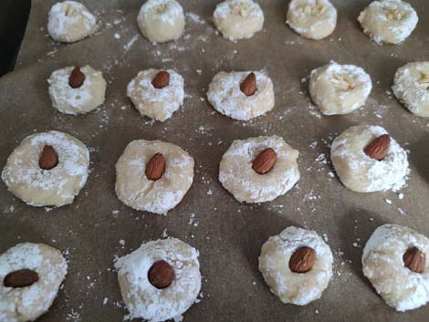 Mąkę migdałową, cukier i białka łączymy na jednolitą masę. Następnie chłodzimy w lodówce co najmniej pół godziny. Następnie robimy małe kulki i obtaczamy je w cukrze pudrze. Na środek 1 kulki wciskamy 1 migdał. Pieczemy przez 15-16 minut w funkcji góra-dół w 180C.