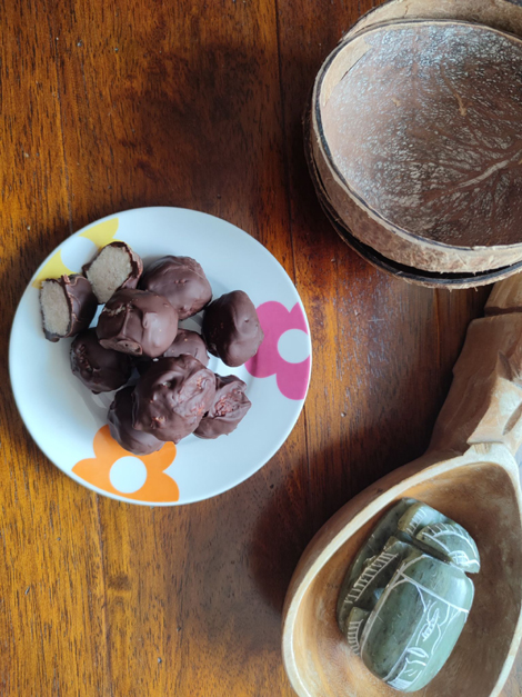 Mus, miód i wiórki lekko blendujemy razem. Formujemy z masy kulki i wkładamy na kilka minut do zamrażarki, by stwardniały. Czekoladę rozpuszczamy w kąpieli wodnej, a następnie zanurzamy w niej kokosowe kulki. Odstawiamy kulki do wystygnięcia. Przechowujemy w pojemniku w lodówce.