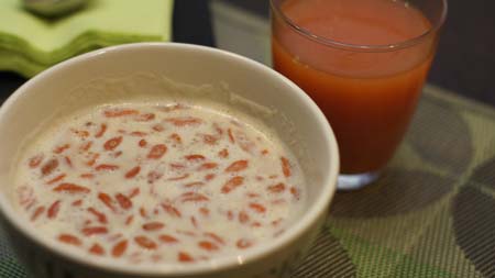 Następna propozycja na bardzo zdrowe śniadanie z dużą ilością błonnika. Idealne danie dla osób mających skazę białkową. Napój migdałowy zwany też mleczkiem migdałowym można kupić, jak i zrobić samemu (przepisu na napój migdałowy szukaj na mojej stronie). Amarantus stanowi cenne źródło łatwo przyswajalnego białka, które nie zawiera glutenu. Zaś jagody goji są owocami kolcowoju, który rośnie w Himalajach. Zawierają wiele cennych substancji: np. 18 rodzajów aminokwasów, witaminę C, z grupy B, żelazo, wapń, cynk, selen oraz flawonoidy. Chińczycy uważają, że jedzenie jagód goji, zapewnia zdrowie i długowieczność. Po takim śniadaniu przywitamy poranek pełni energii. Proponuję jeszcze wypić sok z czerwonych pomarańczy i bomba witaminowa z rana zaliczona:)