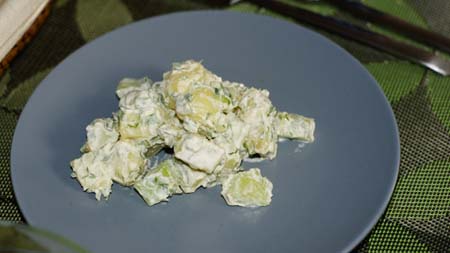Ziemniaki szoruję szczoteczką i gotuję w mundurkach do miękkości. Następnie jak wystygną obieram ze skórki i kroję w dużą kostkę. Ogórka obieram ze skóry i także kroję w dużą kostkę. Zielonkę drobno siekam. Wszystkie składniki mieszam, dodaję sól i dużo pieprzu łącząc z majonezem.