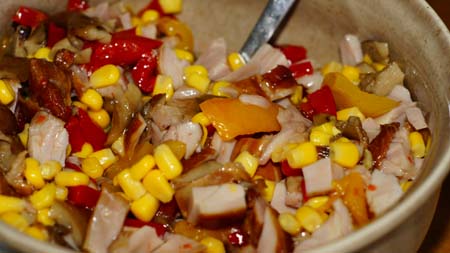 Mięso odkroiłam od kości i pocięłam je w kostkę. Paprykę odsączyłam z zalewy i pokroiłam w dużą kostkę. Grzyby pokroiłam w kostki. Kukurydzę odsączyć na sicie. Wystkie składniki połączyć i dodać pieprz do smaku.