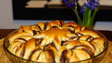 Bardzo smaczny wieniec drożdżowy i jaki efektowny. Na pierwszy rzut oka zrobienie takiego kwiatu z ciasta wydaje się trudne, ale wierzcie mi to nic trudnego i każdy sobie z tym poradzi. Każdy łasuch lubiący czekoladę z przyjemnością skosztuje tego ciasta. Nadziewać możemy nie tylko Nutellą, ale także orzechami z roztopioną czekoladą, masą makową, serową, dżemami - pełna dowolność. Gorąco zapraszam!