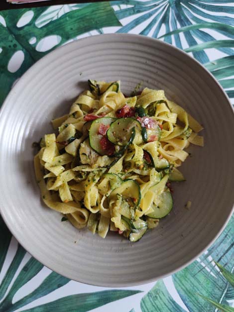 Pomimo mojej nietolerancji na mąkę pszenną, od czasu do czasu musze zjeść włoski makaron. Po prostu kocham włoską kuchnię! Danie jest pyszne za sprawą trzech składników: boczku, cukinii i pistacji. Makaron przygotowany w ten sposób uwielbiam i Wam tez radzę spróbować. Zapraszam!