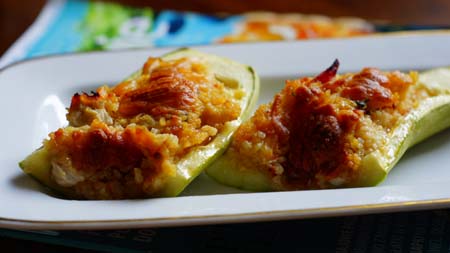 Nadziewaną cukinię można robić na różne sposoby, piec w piekarniku, na grillu czy na parze. Nadzienie - to co mamy w lodówce :) lub to na co mamy ochotę w danej chwili. Ja dziś do nadzienia użyłam kuskusu, ale jeśli nie lubicie, użyjcie ryżu, kaszy jaglanej czy samych warzyw. Zapraszam!