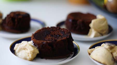 Jest to słynny francuski deser - po prostu babeczki z płynną czekoladą w środku. Gdy przekroimy babeczkę ze środka powinien wypłynąć czekoladowy sos. Sekretem tego deseru jest krótki czas pieczenia - tyle ile wymaga przepis, nie wydłużajmy nawet o minutę, bo wtedy nie wypłynie nam czekoladowa masa ze środka. Babeczki są pyszne i niemiłosiernie kuszą smakiem. Polecam je podawać z gałką lodów waniliowych lub z bitą śmietaną. Zapraszam!