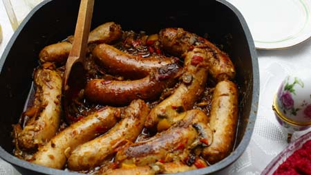 To danie świąteczne do dietetycznych nie należy, ale jest przepyszne i zawsze znika ze stołu!!!!! Kiełbaski przechodzą smakiem duszonych warzyw polanych piwem i rozpływają się w ustach. Jeśli ktoś nie przepada za białą kiełbasą ten sposób podania jak najbardziej polecam. Nie wiem skąd mam przepis, robię go od lat na Wielkanoc. Zapraszam!