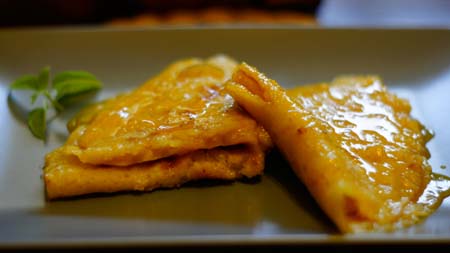 Crepe Suzette-francuski deser składający się z naleśników skąpanych w gęstym sosie pomarańczowym z wyczuwalną nutką alkoholu. Naleśniki bez farszu też mogą być pyszne. Sos z pomarańczy jest łatwy w przygotowaniu i bardzo dobry.Przy okazji możemy naczyć się flambirowania czyli podpalanie dań alkoholem. Warto zadbać o to, by sos był wykonany z ekologicznych pomarańczy. Spróbujcie!
